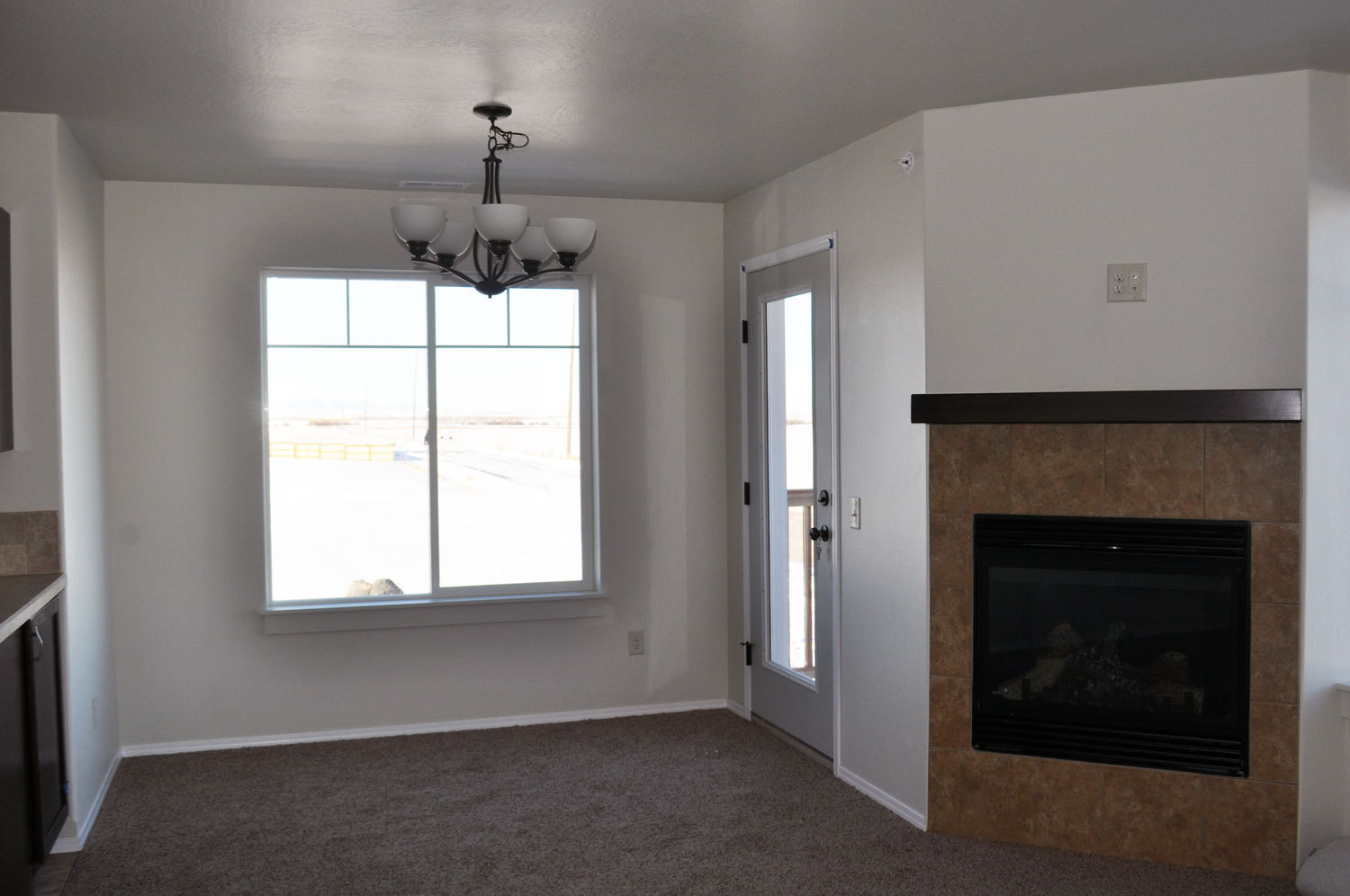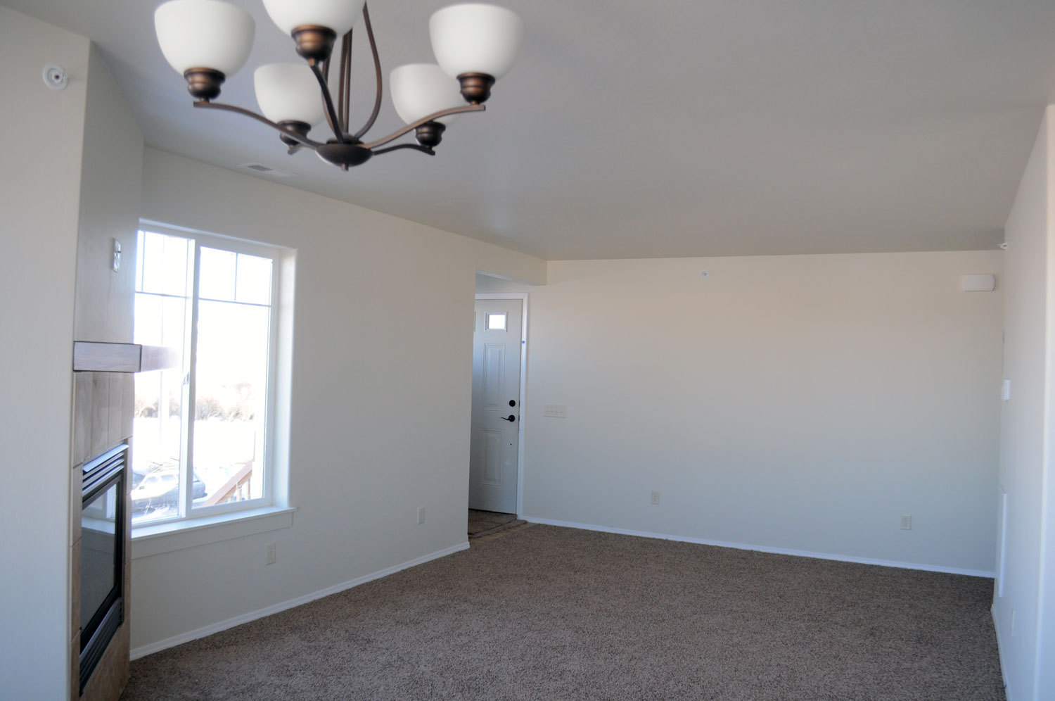 Open living area featuring a cozy fireplace